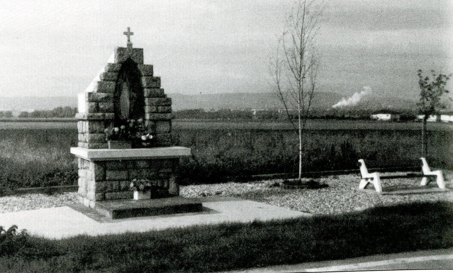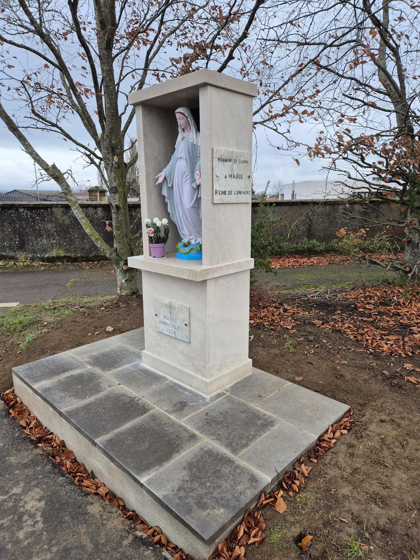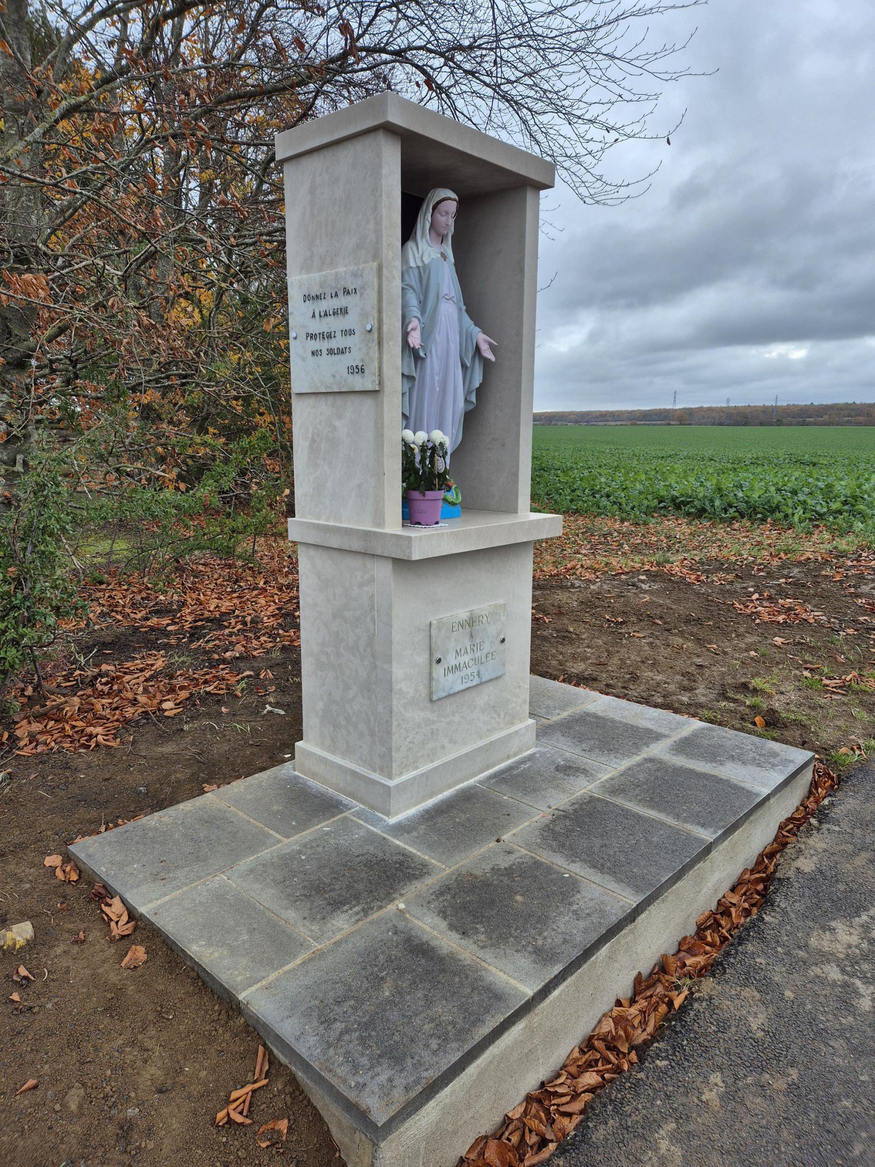 Une dalle de béton est coulée, un petit monument en pierre de Jaumont y est édifié avec une niche destinée à recevoir la statut de Marie, l'Immaculée Conception. Autour, un parterre de fleurs, des buissons et arbres y sont aménagés.