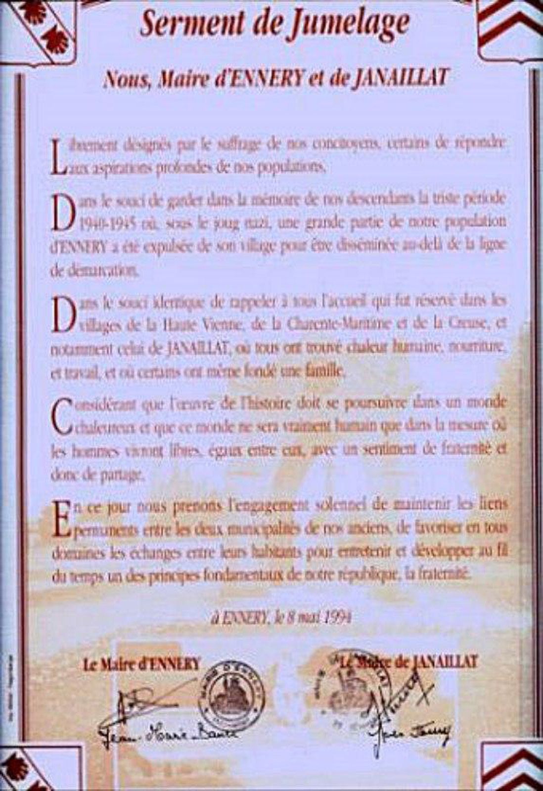 Le 15 avril 2012, M. Jean-Pierre Borges (maire de Ennery-en-Vexin (Val d’Oise) et M. Jean-Marie Bauer (maire de Ennery (Moselle) ont scellé un jumelage entre leurs deux communes.