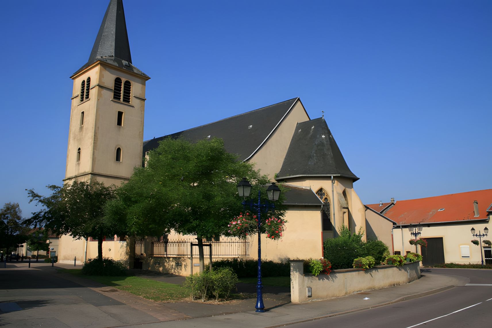 L'église d'ENNERY occupe le fond d'une place plantée d'arbres et bordée sur le côté droit par des bâtiments d'une belle uniformité, dont la mairie. Cette place fut donnée aux habitants par Nicolle IV, conseiller de l'empereur Charles V dit Charles Quint, en 1537. Une plaque apposée sur la façade de la maison Folny rappelle cette donation.