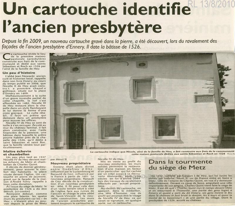 En 1360 la famille de HEU avait acquis la totalité du domaine d'ENNERY. Le château-haut d'ENNERY que WERNZEL de Luxembourg avait détruit en 1380 a été reconstruit par Nicolas de HEU en 1390. Nicolle IV de HEU offrit à ENNERY la place du village (actuellement place Robert-Schumann). Scellé dans le mur d'une maison, en prolongement de la mairie, on peut voir un cartouche discret, pouvant passer inaperçu, car placé à environ 6 mètres du sol. En le regardant, on ne saisit pas de prime abord de quoi il est question, car écrit en latin, et l'on pourrait passer son chemin sans chercher à comprendre. Pourtant, ce cartouche se révèle d'une grande importance pour les habitants d'ENNERY tant sur le plan historique que sur celui de la vie actuelle puisqu'il est question de la grande place du village que Nicolle IV de HEU, Conseiller de Charles Quint, offrit à perpétuité, en 1537, aux habitants d'Ennery pour leur confort à tous.