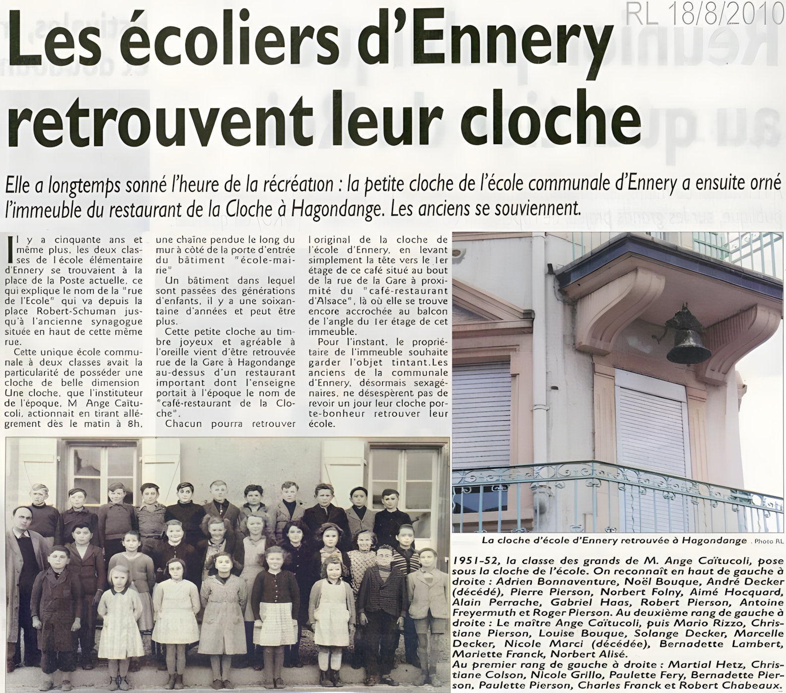 Nostalgie encore avec la découverte de la cloche de l’ école, disparue depuis de nombreuses années, et actuellement au fronton d’un immeuble à HAGONDANGE. Voir l’ article du RL rédigé à cette occasion.