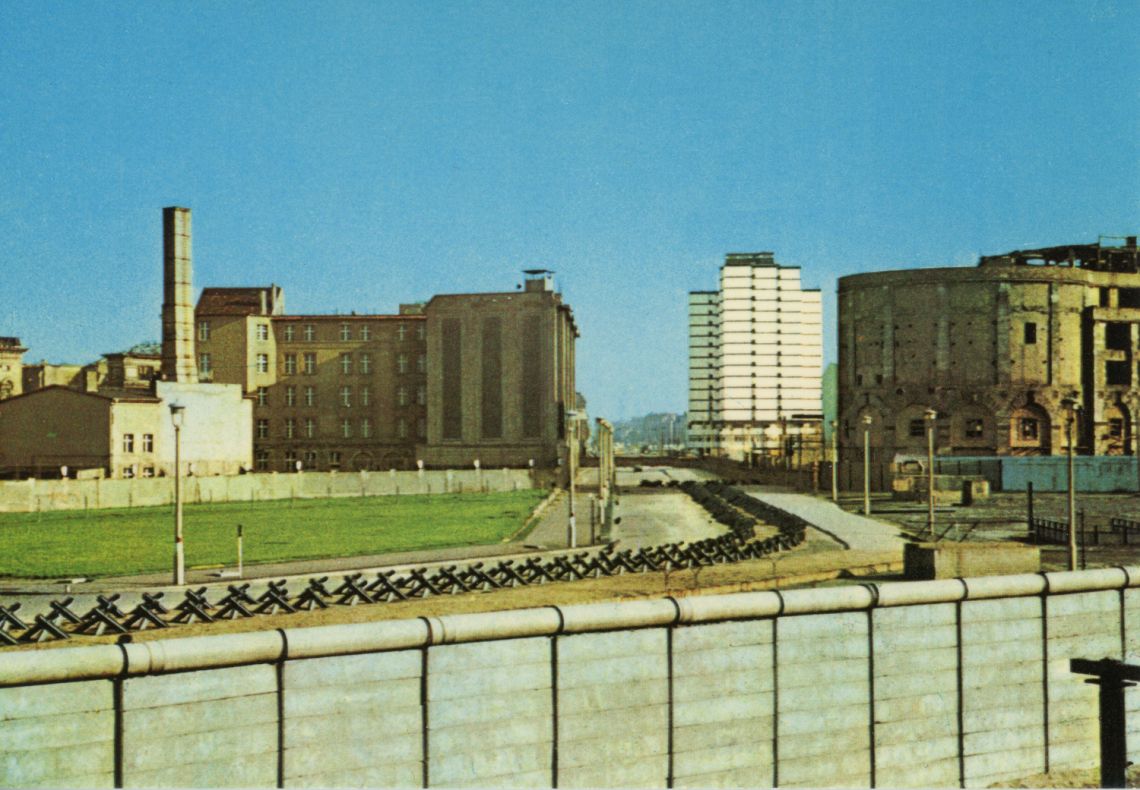 Vue par dessus le mur de la Potsdamer Platz à Berlin-Est. Au fond la nouvelle tour de télévision de Berlin-Est.