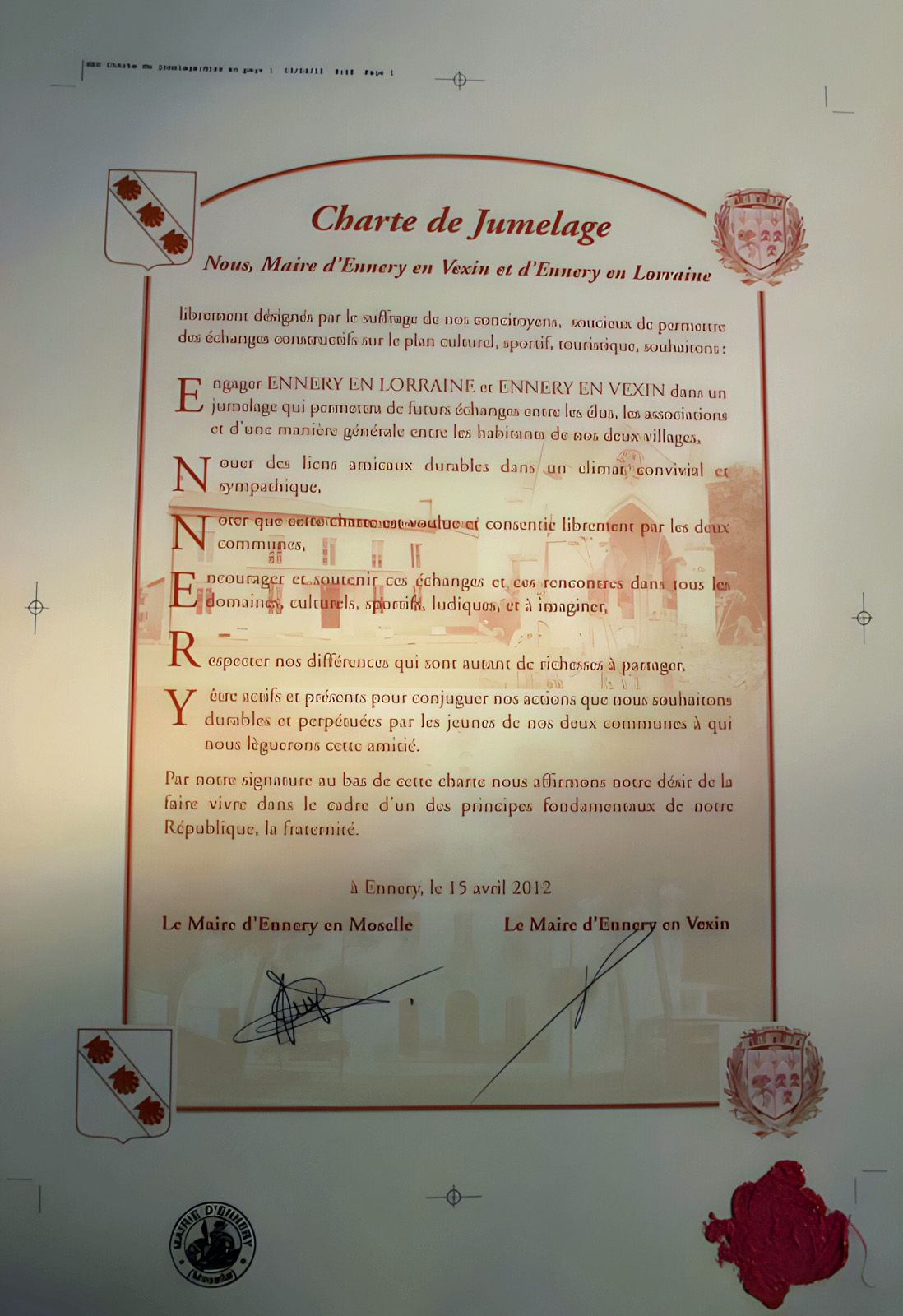 Le 15 avril 2012, M. Jean-Pierre Borges (maire de Ennery-en-Vexin (Val d’Oise) et M. Jean-Marie Bauer (maire de Ennery (Moselle) ont scellé un jumelage entre leurs deux communes.