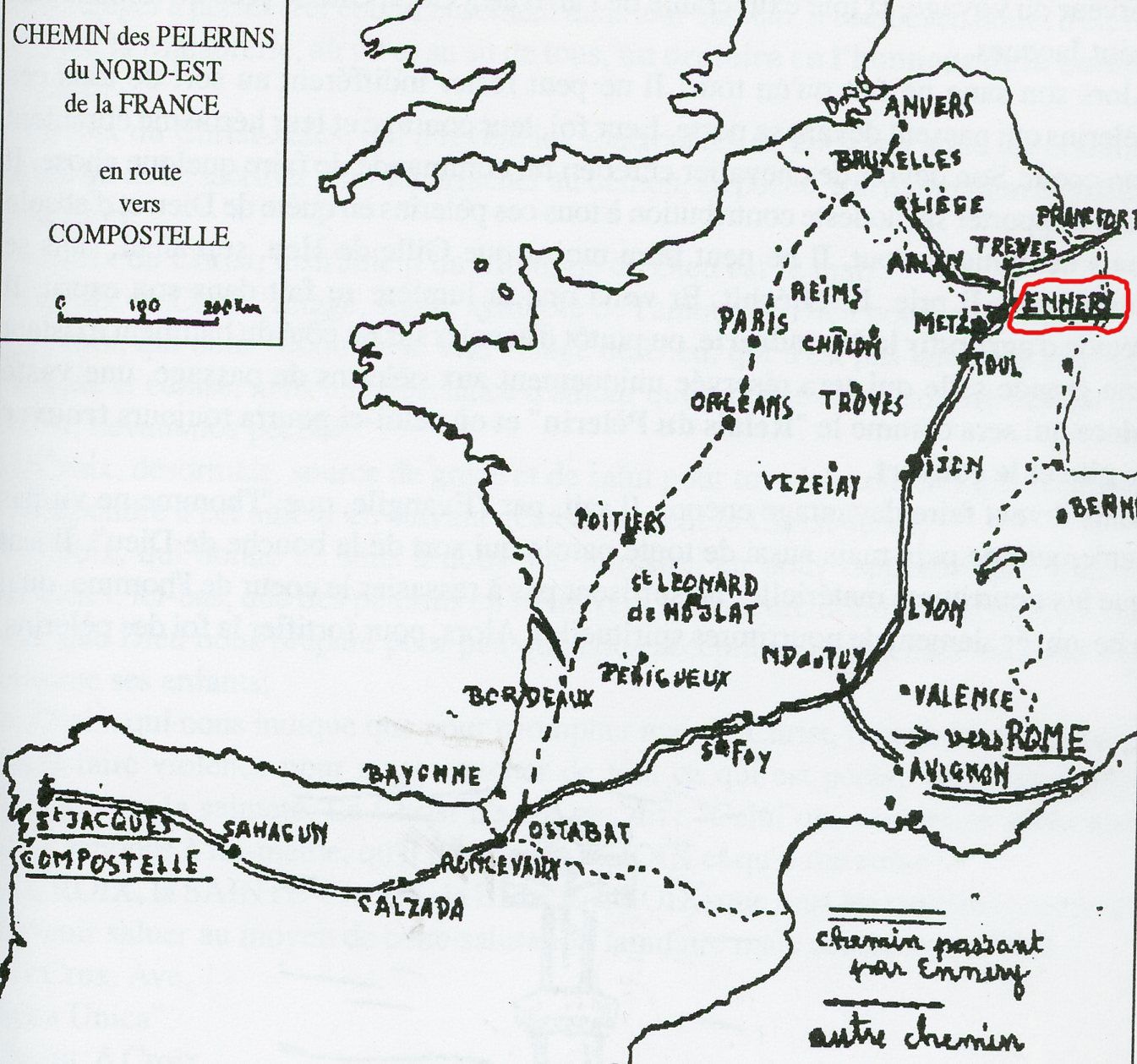 Car la route qui passe devant Ennery, qui longe la Moselle, est une des routes incontournables pour se rendre à Compostelle ou à Rome. Sur cette route cheminent, en effet, les pélerins venant de Gand, de Liège, de Luxembourg, de Cologne, de Francfort, de Trèves et même des villes de Pologne comme Szczecin et Gdansk.