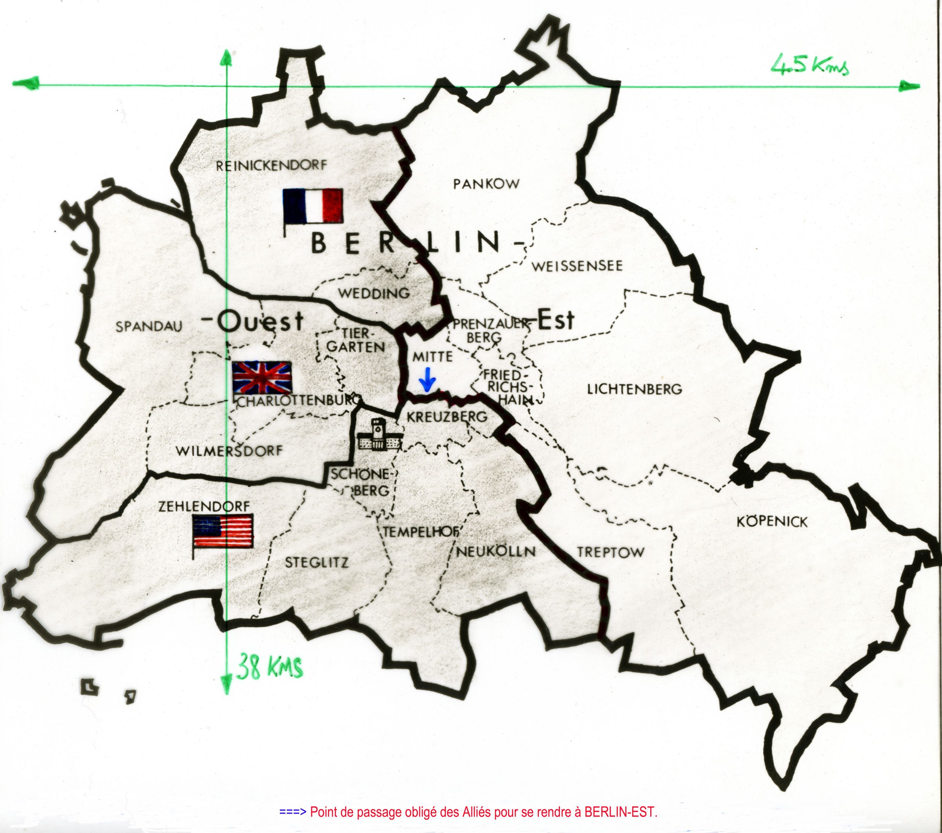 . Le MUR en secteur français, au Nord-Ouest de Berlin, était long de 41 kilomètres. Il comprenait 64 miradors occupés chacun par 2 à 3 GRESO. Certains miradors n'étaient occupés que la nuit. Pour la surveillance proprement dite du MUR, la Gendarmerie s'était vue confier un tronçon de 10,600 kilomètres de limites sectorales en zone urbaine. Les deux Corps, 46° R.I. et 11° R.Ch. avaient la charge du complément. Cependant, le Détachement de Gendarmerie, avait autorité sur l'ensemble dans le cadre de la surveillance générale du secteur et de la constatation des incidents de toute nature.