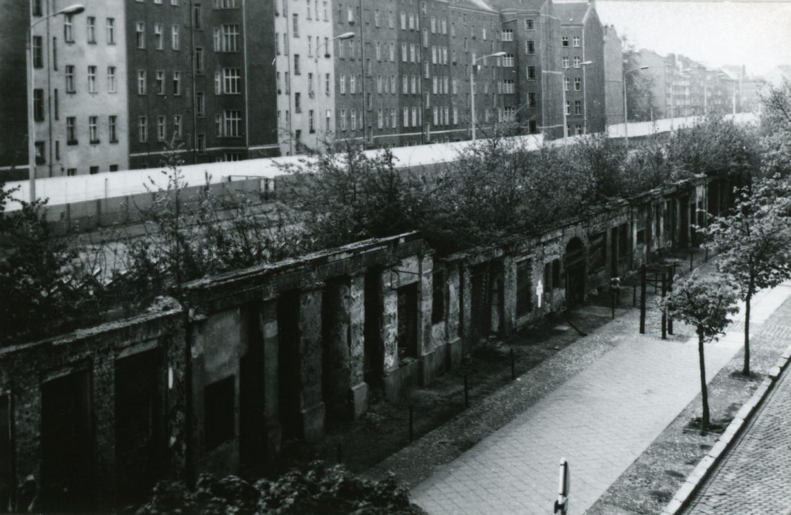Les restes de la Bernauerstrasse. Les étages ont été rasés, les façades bouchées ont servi de premier mur.