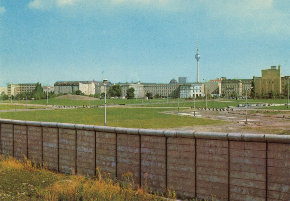 Vue par dessus le mur de la Potsdamer Platz à Berlin-Est. Au fond la nouvelle tour de télévision de Berlin-Est.